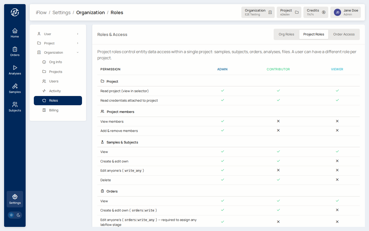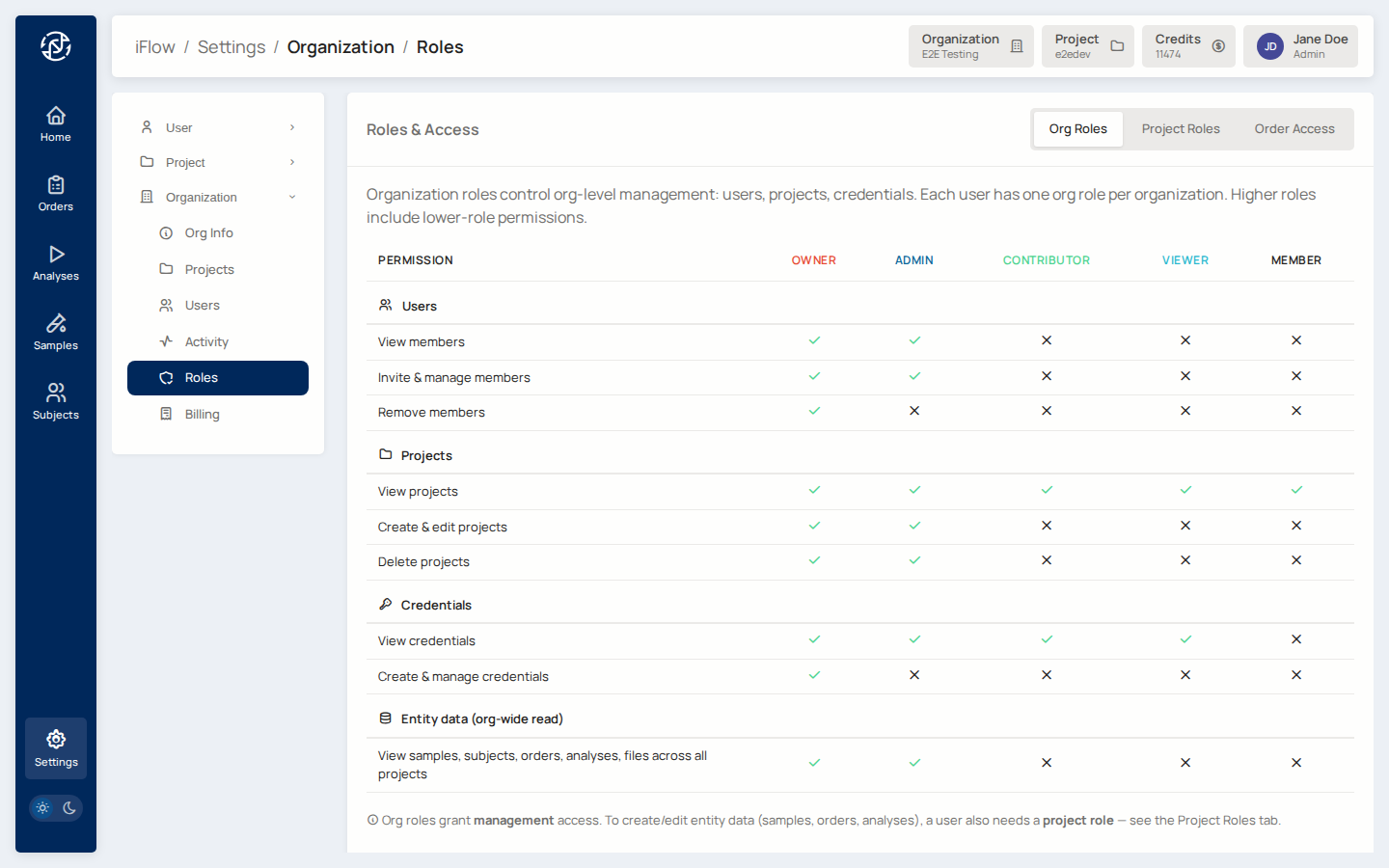 To create or edit entity data (samples, orders, analyses), a user also needs a project role. An org Admin with no project role cannot add a sample to a project — they can only manage membership.