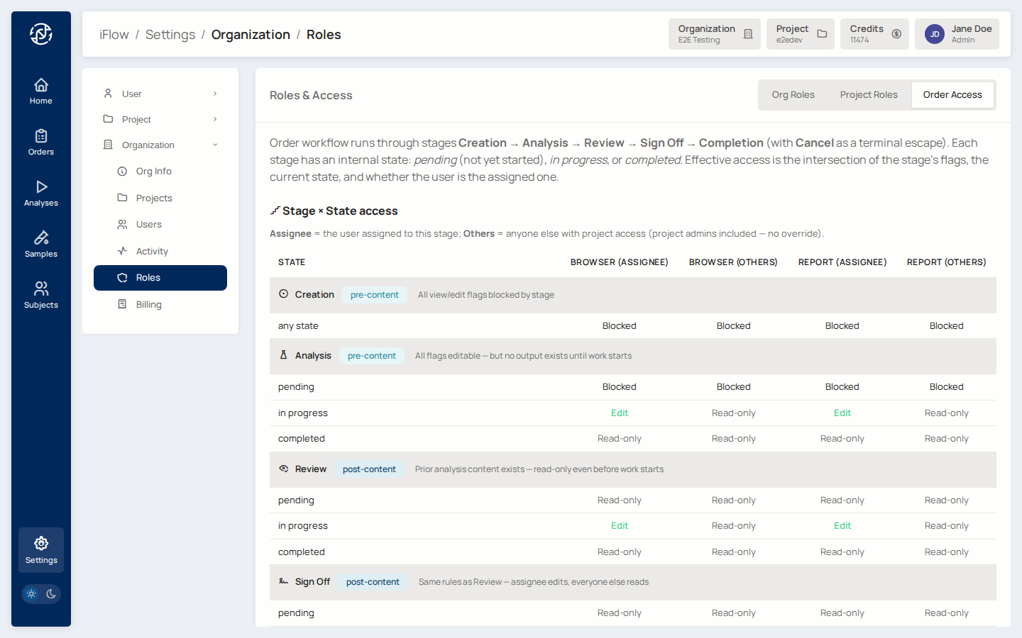 An order runs through five stages: Creation → Analysis → Review → Sign Off → Completion. Each stage has an internal state — pending, in progress, or completed. Effective access is the intersection of: